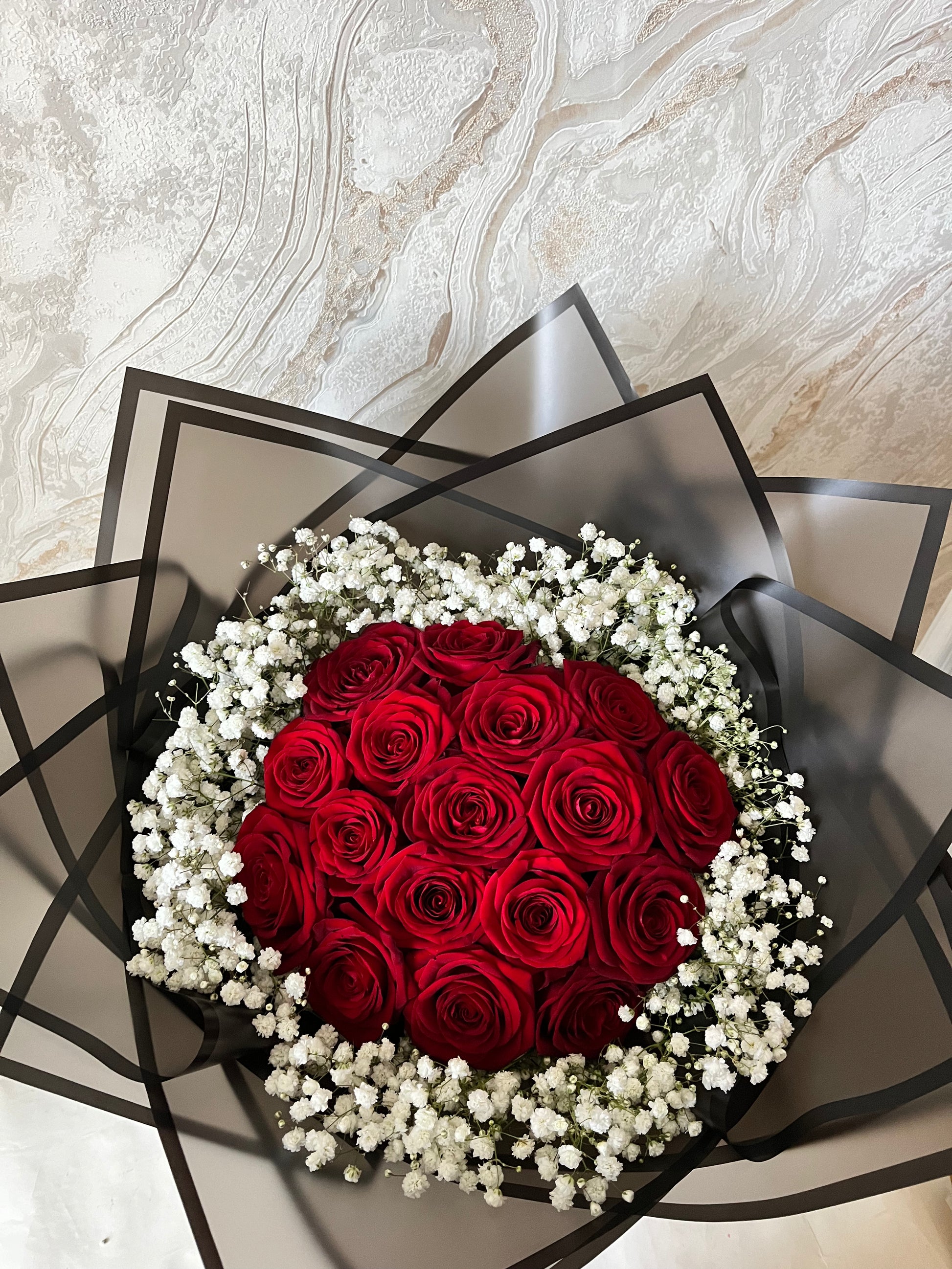 Wow your loved one with 20 stunning red roses, expertly crafted and accompanied by a delicate gypsophila rim. Packaged beautifully and ready to impress.